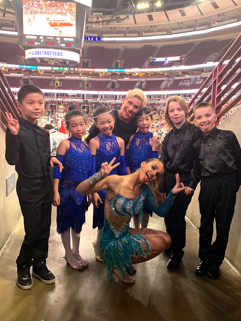 新年前夜AACE国标班受邀承担United Center Globetrotter 中场拉丁表演。Tommye 老师专业的儿童班、成人班群舞,双人舞编舞,几十位舞者们伴着火辣的的《Watch Out For This》 音乐,用热烈激情的舞步High翻全场。几千观众中,有的和着音乐给我们击掌打节拍, 有的从自己座位上站起来跟我们一起起舞, 还有的观众忙着录像照相,记录分享新年前的开心一刻。